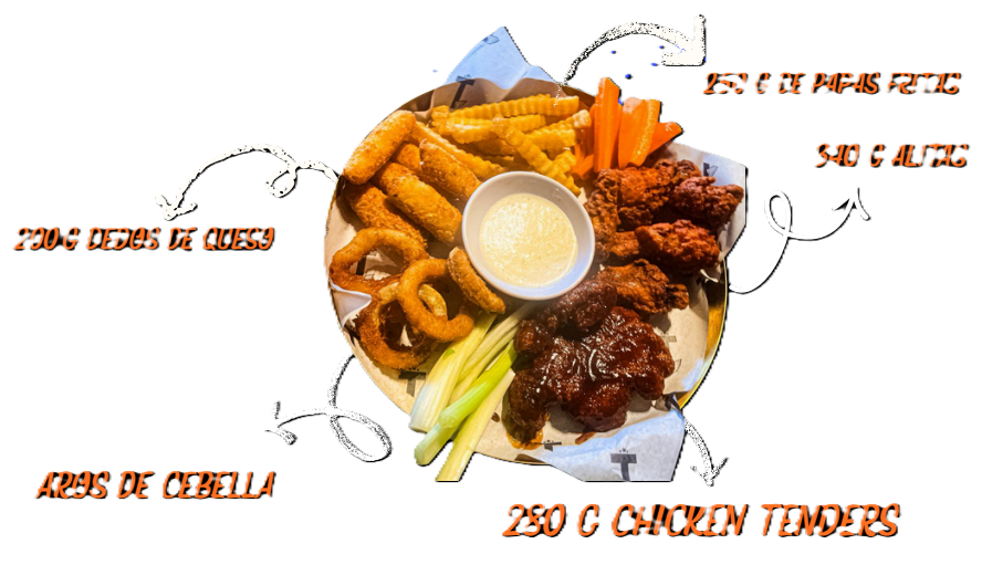 Hazla mix. Disfruta de 340g de alitas y 160g de chicken tenders en tu salsa favorita